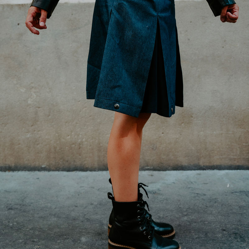 Grâce à un système discret de boutons-pressions placés sur les côtés et au milieu, elle se referme en un geste simple… et se transforme en short.